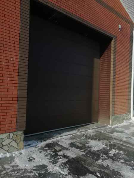 - Секционные ворота. Ворота данного типа состоят из сэндвич-панелей, которые соединяются друг с другом петлями. При их открывании панели поднимаются вверх, двигаясь по направляющим;